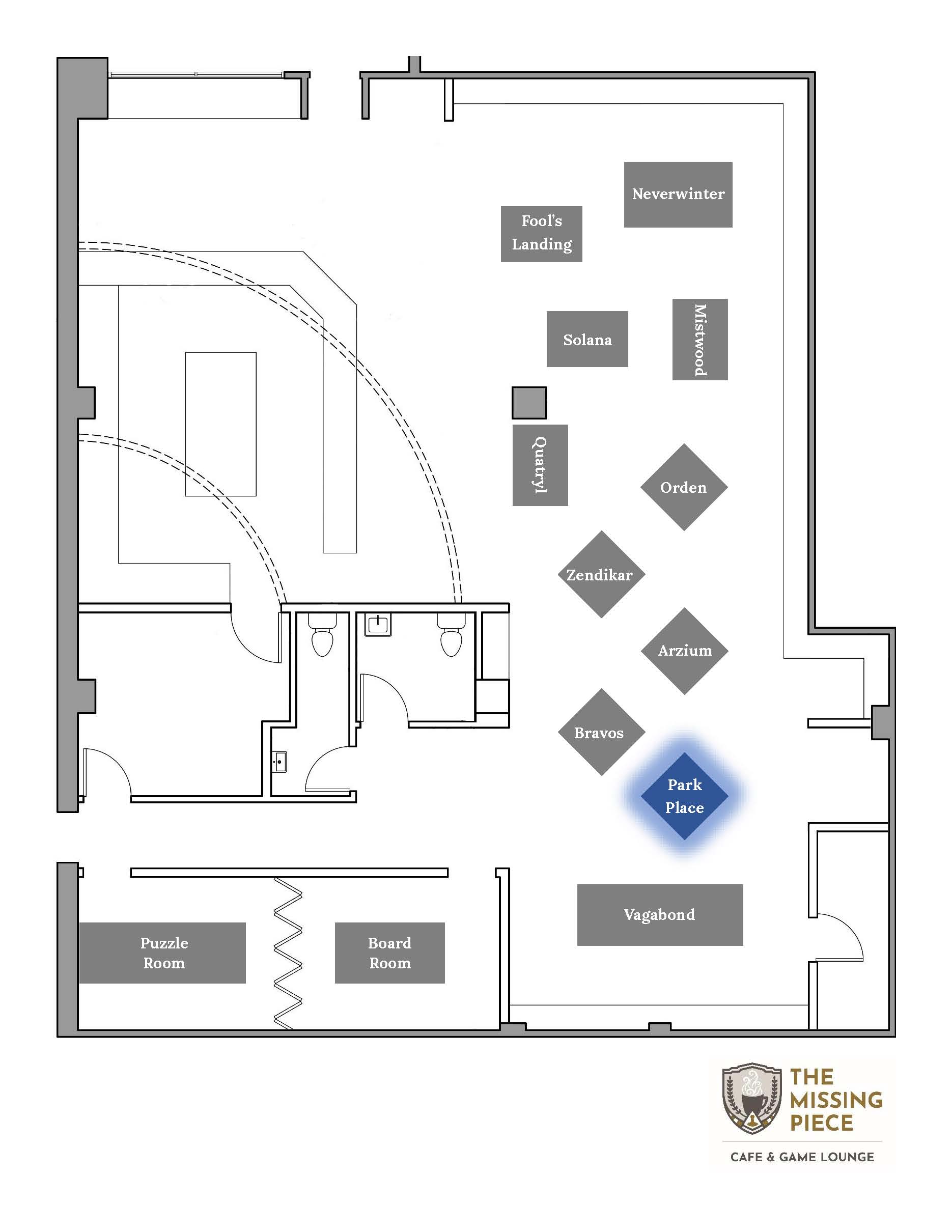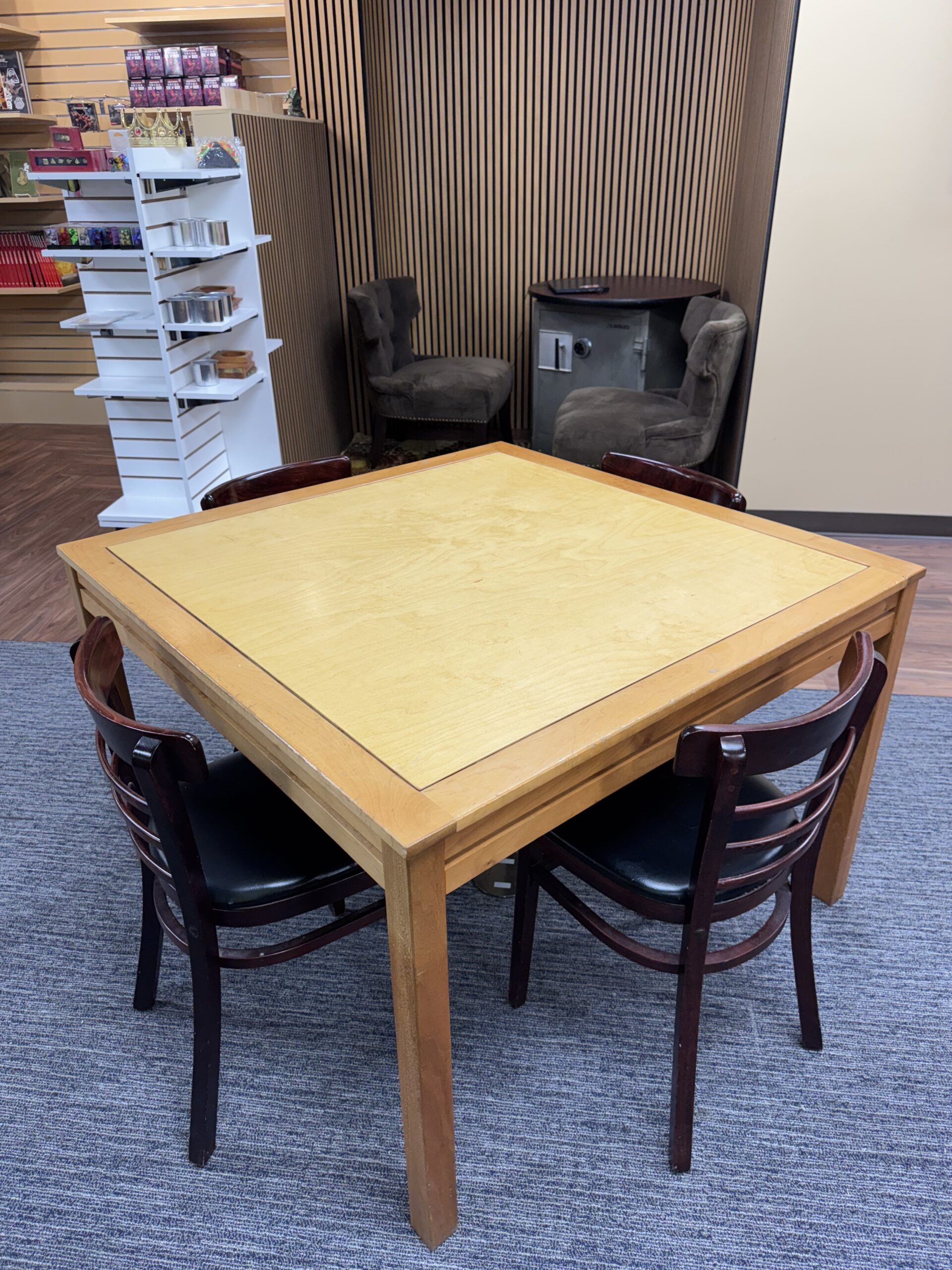 Our Park Place table is tucked away near the back of the shop right next to one of our cozy nooks.  You'll also have a great view of our Used Games & Puzzles shelf - don't forget to take a moment to browse there and find a hidden gem to take home with you!